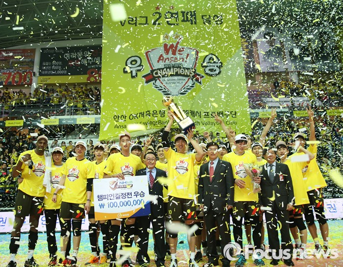 (안산=포커스뉴스) 24일 안산상록수체육관에서 열린 2015-2016 V-리그 남자부 챔피언결정전에서 현대캐피탈을 3승1패로 물리치고 2연패를 달성한 OK저축은행 선수들이 우승 트로피를 높이 들고 환호하고 있다.