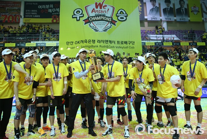 (안산=포커스뉴스) 24일 안산상록수체육관에서 열린 2015-2016 V-리그 남자부 챔피언결정전에서 현대캐피탈을 3승1패로 물리치고 2연패를 달성한 OK저축은행 김세진 감독을 비롯한 선수들이 우승 트로피를 들고 환호하고 있다.