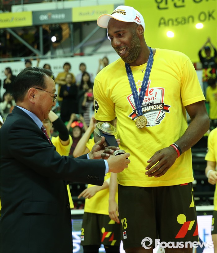 (안산=포커스뉴스) 24일 안산상록수체육관에서 열린 2015-2016 V-리그 남자부 챔피언결정전에서 MVP로 선정된 OK저축은행 시몬이 구자준 배구연맹 총재로부터 트로피를 받고 있다.