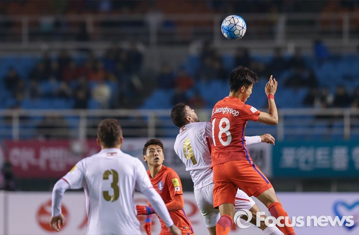 (안산=포커스뉴스) 24일 오후 경기도 안산 와스타디움에서 열린 2018 러시아 월드컵 아시아 2차 예선 7차전 대한민국 대 레바논 경기에서 양 팀 선수들이 공중볼 다툼을 하고 있다.