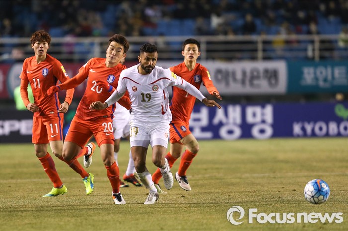 (안산=포커스뉴스) 24일 오후 경기도 안산 와스타디움에서 열린 2018 러시아 월드컵 아시아 2차 예선 7차전 대한민국 대 레바논 경기에서 장현수 선수가 레바논 선수와 몸싸움을 하고 있다.