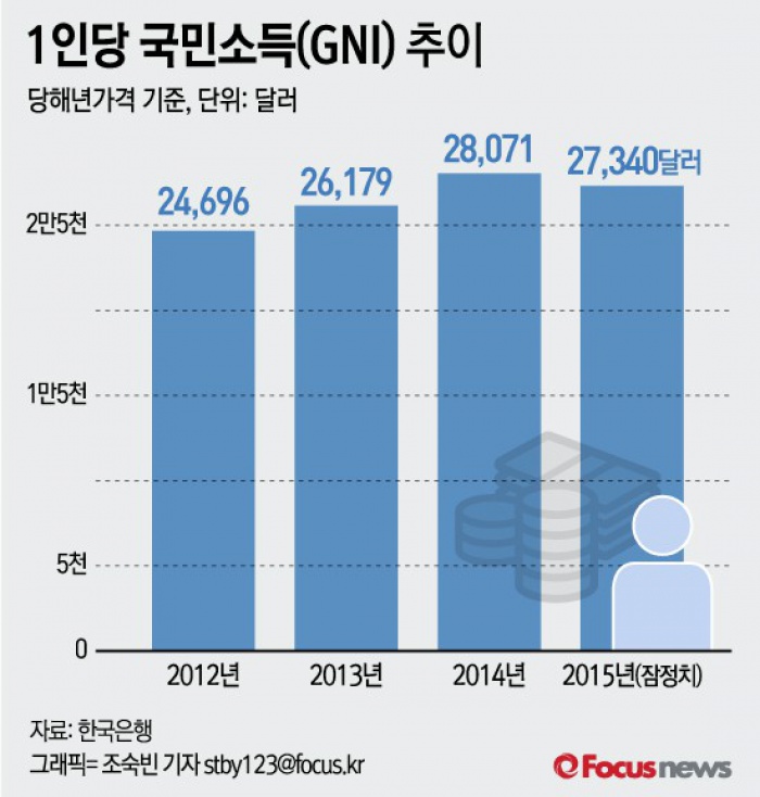 (서울=포커스뉴스) 25일 한국은행이 발표한 ‘2014년 국민계정(확정) 및 2015년 국민계정(잠정)’에 따르면 지난 2015년 우리나라의 1인당 국민소득(GNI)은 2만7340달러로 전년대비 2.6% 내린것으로 나타났다.