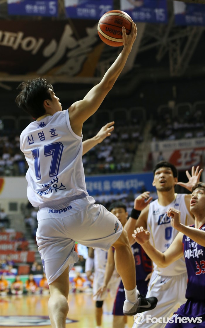 (고양=포커스뉴스) 25일 고양체육관에서 열린 2015-2016 프로농구 챔피언결정전 4차전 오리온-KCC경기에서 KCC 신명호가 레이업슛을 쏘고 있다.