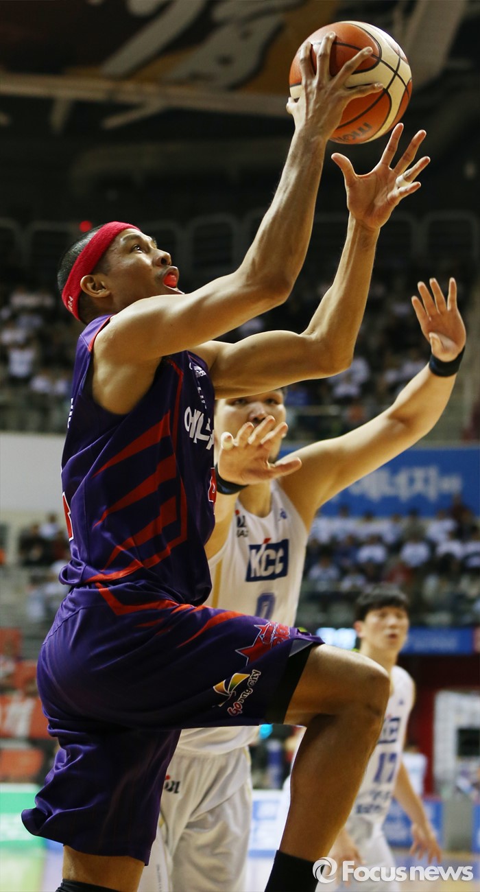 (고양=포커스뉴스) 25일 고양체육관에서 열린 2015-2016 프로농구 챔피언결정전 4차전 오리온-KCC경기에서 오리온 문태종이 KCC 하승진의 수비에 앞서 골밑슛을 시도하고 있다.