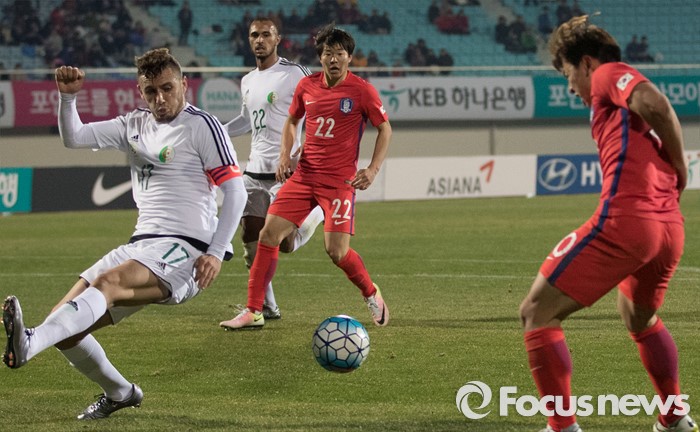(이천=포커스뉴스) 25일 오후 경기 이천종합운동장에서 열린 KEB하나은행 초청 올림픽대표 대한민국과 알제리의 친선경기에서 후반전 한국 박정빈이 권창훈에게 패스를 하고 있다.