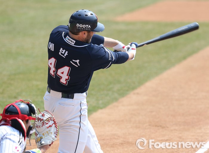 (서울=포커스뉴스) 27일 서울 잠실구장에서 열린 2016프로야구 시범경기 두산-LG 경기에서 1회초 2사 1루에서 두산 에반스가 1타점 좌중간 2루타를 날리고 있다.
