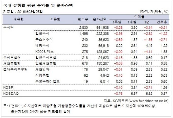 27일 펀드평가사 KG제로인이 지난 25일 공시된 기준 가격으로 펀드 수익률을 조사한 결과, 전체 국내 주식형펀드는 한 주간 0.25% 하락했다.