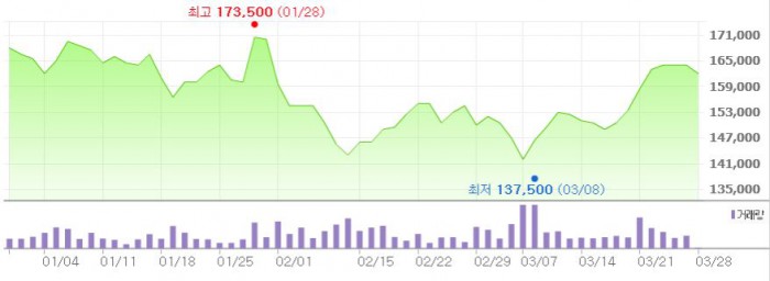 그는 "2분기에는 실적 개선이 예상된다"며 만도의 2분기 매출액과 영업이익으로 각각 1조4062억원,747억원을 전망했다. 이는 전년 동기 대비 각각 6.5%, 5.3% 증가한 수치다.최근 3개월간 만도 주가 추이 <그래픽출처=네이버>