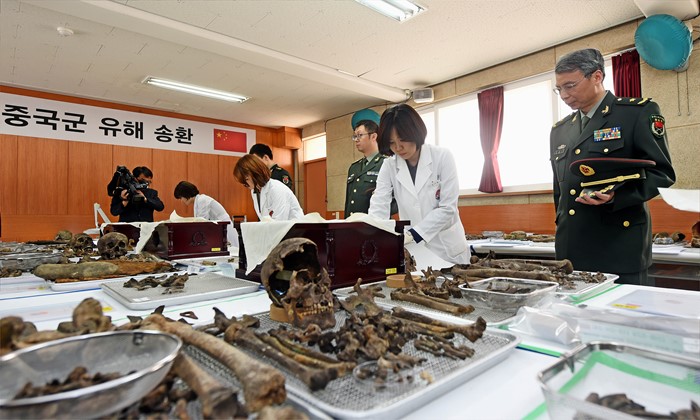 (서울=포커스뉴스) 28일 오후 경기도 파주지역에 마련된 '중국군 유해 임시안치소'에서 지난해 발굴한 중국군 유해 36구에 대한 유해발굴감식단 단원들이 주한중국대사관 국방무관 두농이(오른쪽) 소장 및 무관단이 참석한 가운데 유해 입관식을 하고 있다.