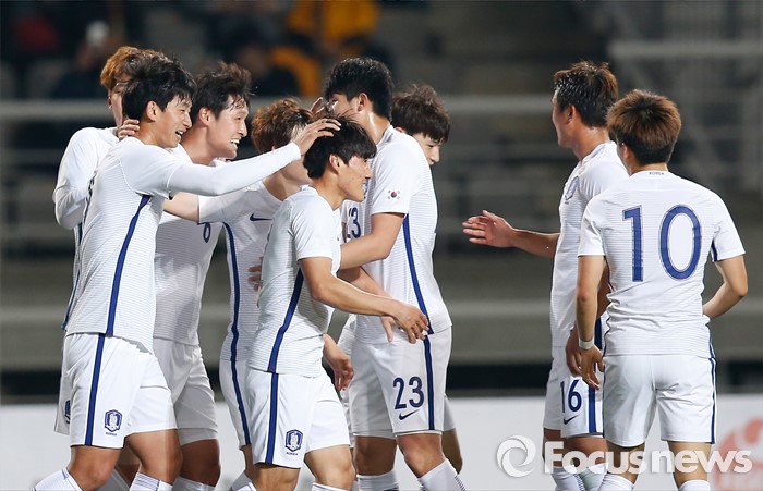 (고양=포커스뉴스) 28일 오후 경기 고양종합운동장에서 열린 올림픽축구대표팀 2차 평가전 대한민국과 알제리의 경기에서 한국 이창민이 전반전 선제골을 넣고 동료선수들과 환호하고 있다.