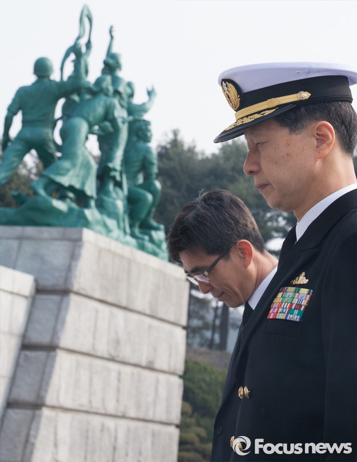 (대전=포커스뉴스) 다케이 도모히사 일본 해상막료장(해군참모총장)이 29일 오전 대전 유성구 국립대전현충원을 방문, 현충탑에서 참배를 하고 있다.