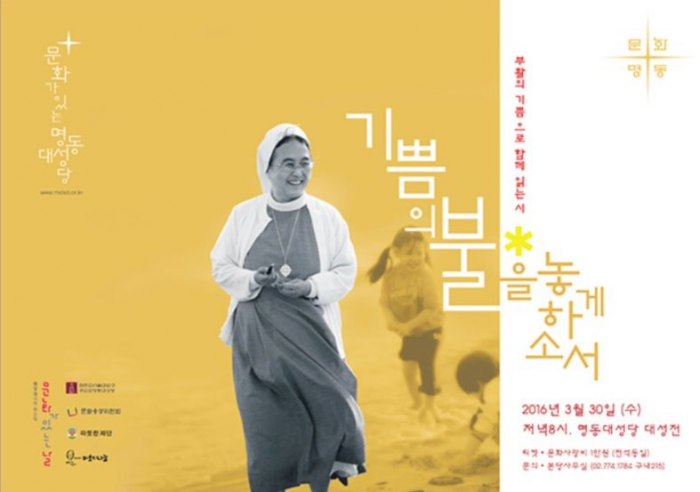 천주교 서울대교구 주교좌 명동대성당은 이해인 수녀의 '부활의 기쁨으로 함께 읽는 시' 음악회를 오는 30일 오후 8시 명동대성당 대성전에서 개최한다고 29일 밝혔다.
