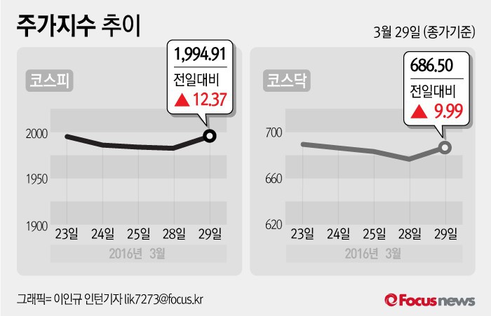 (서울=포커스뉴스) 29일 코스피지수는 전날 보다 0.62%(12.37포인트) 오른 1994.91에 장을 마쳤다. 코스닥지수는 전일 대비 1.48%(9.99포인트) 오른 686.50에 마감했다.