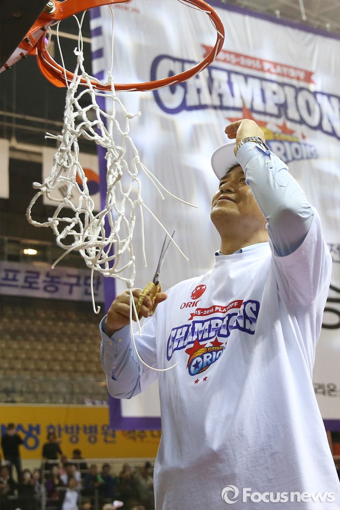 (고양=포커스뉴스) 29일 고양체육관에서 열린 2015-2016 프로농구 챔피언결정전에서 KCC를 4승2패로 물리치고 우승을 차지한 오리온의 추일승 감독이 골망을 커팅하고 있다.