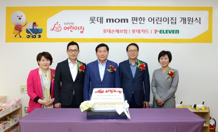이 어린이집은 영유아 총 30여명을 수용할 수 있다.(사진 왼쪽부터) 롯데 mom편한어린이집 최민화 원장, 롯데손해보험 김현수 대표이사, 롯데카드 채정병 대표이사, 코리아세븐 정승인 대표이사, 모아맘보육경영원 최윤이 상무가 롯데 mom편한어린이집 30일 열린 어린이집 개원식 기념촬영을 하고 있다.<사진제공=롯데손해보험>