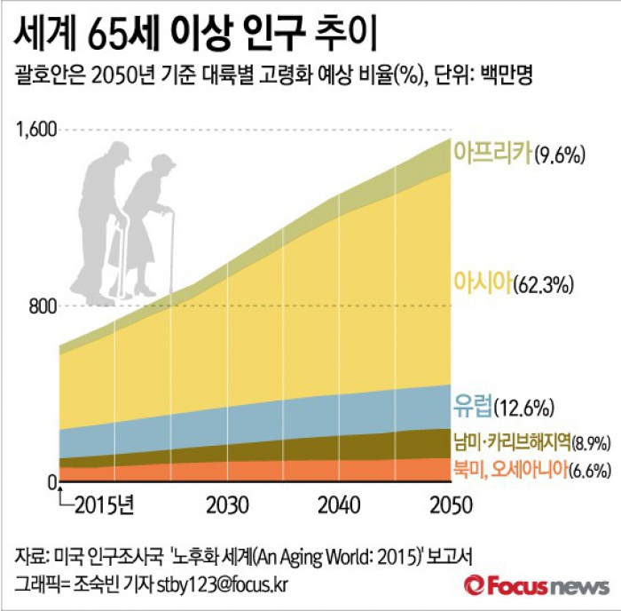 (서울=포커스뉴스) 미국 인구조사국은 28일(현지시간) 발표한 '노후화 세계(An Aging World: 2015)' 보고서를 통해 전 세계에서 65세 이상 인구가 2015년 6억명에서 2050년에는 16억명이 될 것이라고 밝혔다.