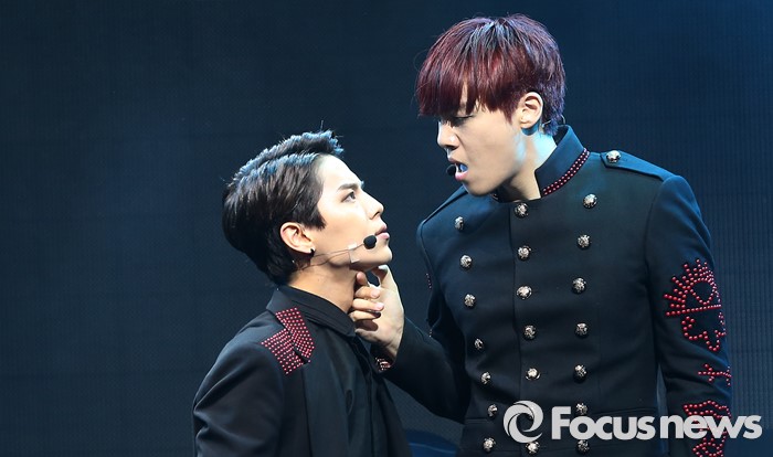 (서울=포커스뉴스) 30일 오후 서울 마포구 예스24 무브홀에서 열린 아이돌그룹 소년공화국의 세번째 미니앨범 [BR: evolution] 발표 쇼케이스에 참석한 멤버 수웅(왼쪽)과 원준이 'Get Down'무대를 선보이고 있다.