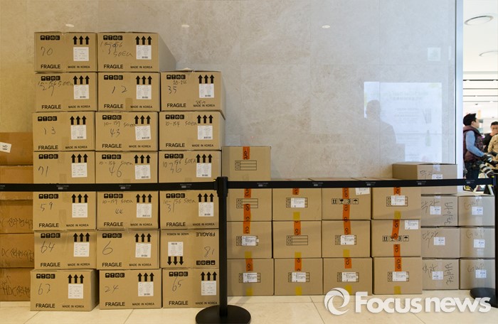 (서울=포커스뉴스) 중국 아오란 그룹 임직원들이 서울 용산구 신라아이파크면세점을 찾은 31일 오후 면세점 물류창고에 평소보다 많은 상품들이 쌓여있다.