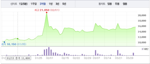앞서 질병관리본부는 3월 30일 지카 바이러스 예방백신 개발에 착수한다고 발표했다. 지카 바이러스는 임신 초기의 임산부가 감염되면 태아의 두뇌가 제대로 성장하지 못하는 ‘소두증’을 유발하는 것으로 알려졌다.진원생명과학 주가흐름<사진출처=네이버 캡쳐>