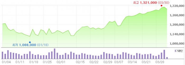 이에 따라 삼성전자에 대한 목표주가를 종전 148만원에서 152만원으로 상향 조정했다.최근 3개월간 삼성전자 주가 추이 <그래픽출처=네이버>