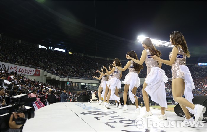(서울=포커스뉴스) 1일 2016 프로야구 개막전 한화-LG 경기가 열린 서울 잠실구장엔 평일임에도 불구하고 팬들이 구장을 가득 메우고 치어리더들은 그 열기를 북돋우고 있다.