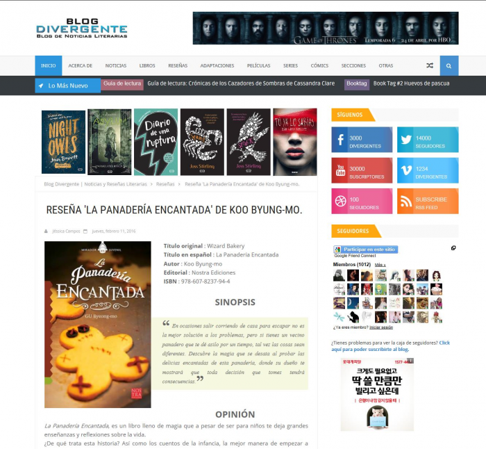 한편 '위저드 베이커리'는 영어 출판을 준비하고 있다. 일본어와 독일어 번역 출판도 계획하고 있다.구병모의 소설 '위저드 베이커리'가 소개된 멕시코 블로그. <사진제공=한국문학번역원>