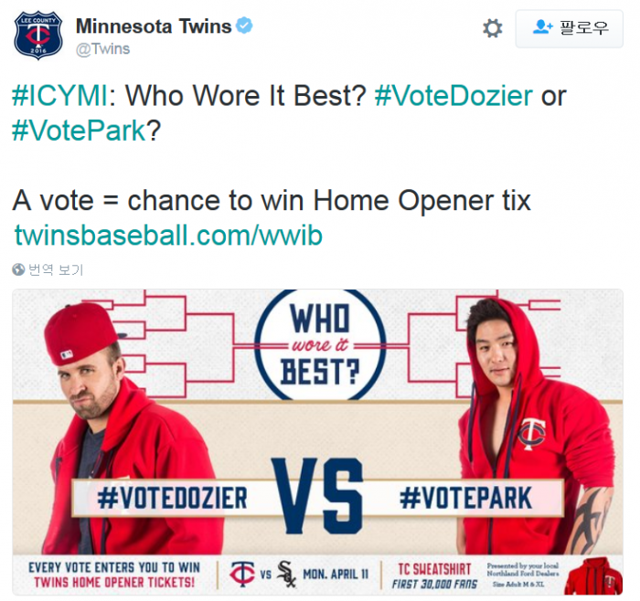 특히 해당 해시태그를 활용해 응원의 메시지나 팀을 향한 바람을 남기면 팔로우를 맺고 있지 않은 미국 현지 팬들에게까지 공유될 수 있어 세계 곳곳의 다양한 팬들과 소통이 가능하며, 미국 팬들 사이에서 트위터를 통해 벌어지는 재미있는 에피소드도 확인할 수 있다.미네소타 트윈스의 구단 후드집업 착용 사진 콘테스트 <사진제공=트위터>