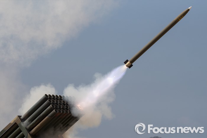(고성=포커스뉴스) 4일 오후 강원도 고성 송지호해변에서 열린 '2016년 전반기 해상사격 훈련'에서 육군 8군단 포병대대 소속 130mm 다련장 구룡이 로켓탄을 발사하고 있다.