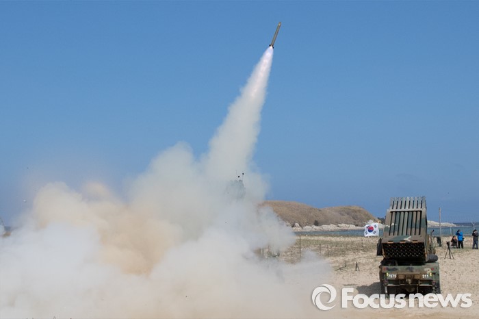 (고성=포커스뉴스) 4일 오후 강원도 고성 송지호해변에서 열린 '2016년 전반기 해상사격 훈련'에서 육군 8군단 포병대대 소속 130mm 다련장 구룡이 로켓탄을 발사하고 있다.