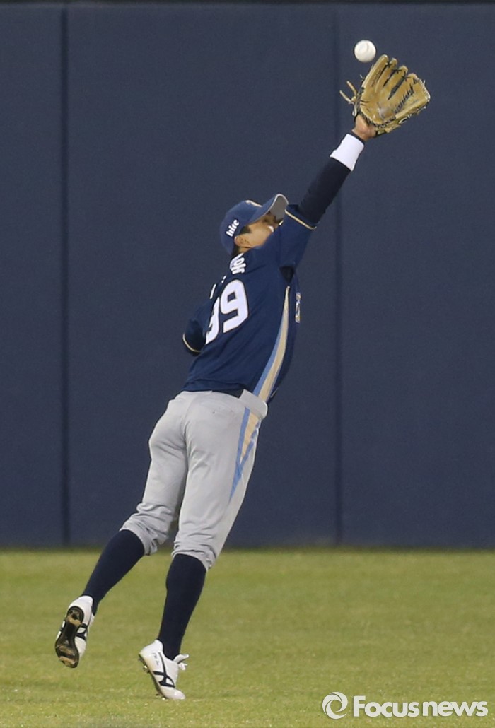 (서울=포커스뉴스) 5일 서울 잠실구장에서 열린 2016프로야구 NC-두산 경기 2회말 2사 만루에서 NC 중견수 이종욱이 두산 허경민의 타구를 잡기위해 몸을 날리고 있다. 허경민은 3루타를 기록하며 주자를 모두 불러 들였다.