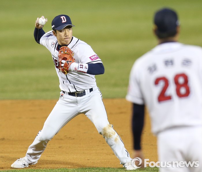 (서울=포커스뉴스) 5일 서울 잠실구장에서 열린 2016프로야구 NC-두산 경기 4회초 2사 만루에서 NC 손시헌의 유격수앞 땅볼을 두산 유격수 김재호가 잡아서 1루로 송구하고 있다.