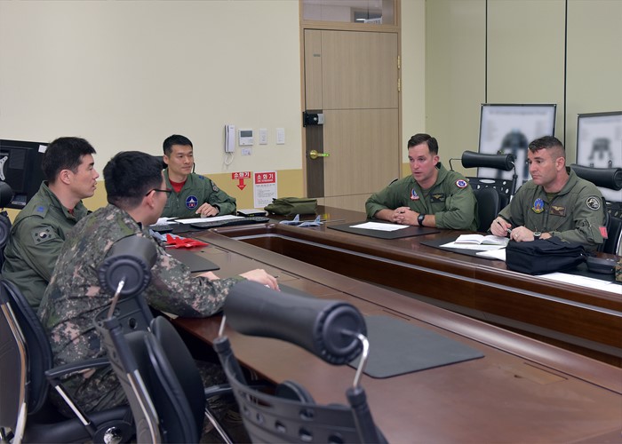 (서울=포커스뉴스) 5일 제16전투비행단 FA-50 전투기와 미 해병대 1항공단 제12비행전대 F/A-18C 전투기 조종사들이 연합비행 훈련에 앞서 브리핑을 하고 있다. <사진제공=공군>