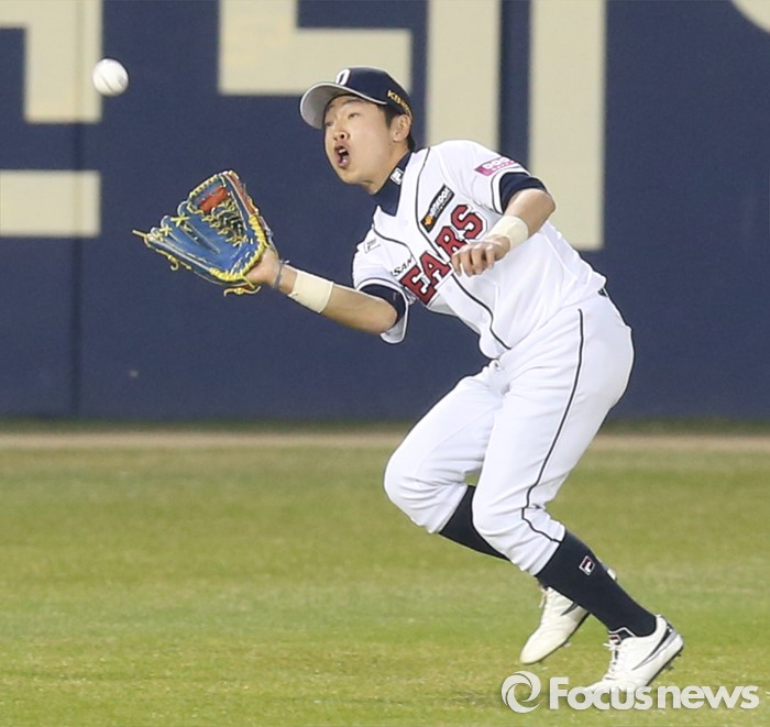 | △ 외야플라이 잡는 정수빈 |