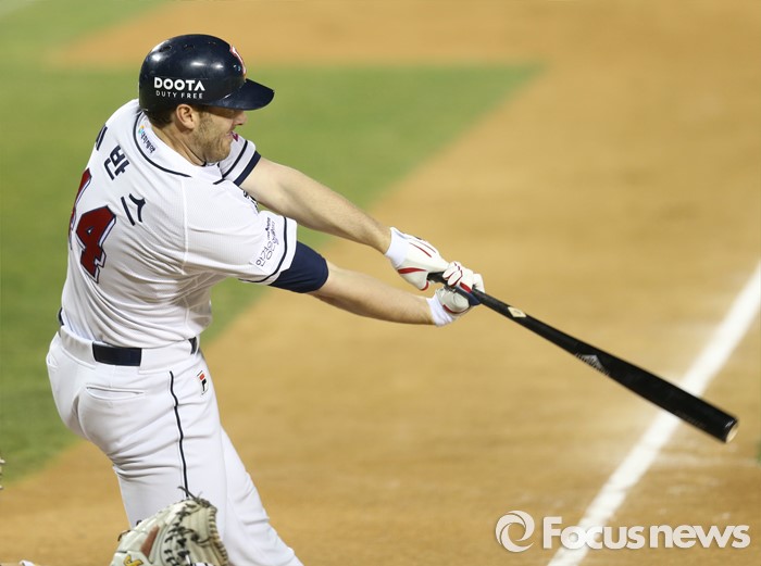 (서울=포커스뉴스) 6일 서울 잠실구장에서 열린 2016 프로야구 NC-두산 경기 6회말 1사후 두산 에반스가 우월 1점 홈런을 날리고 있다.