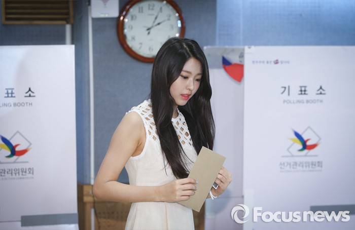 (서울=포커스뉴스) 20대 총선을 닷새 앞두고 사전투표가 이틀동안 실시되는 8일 오후 서울 강남구 청담동주민센터에 마련된 사전투표소에서 총선 홍보대사인 그룹 AOA의 설현이 투표를 하고 있다.