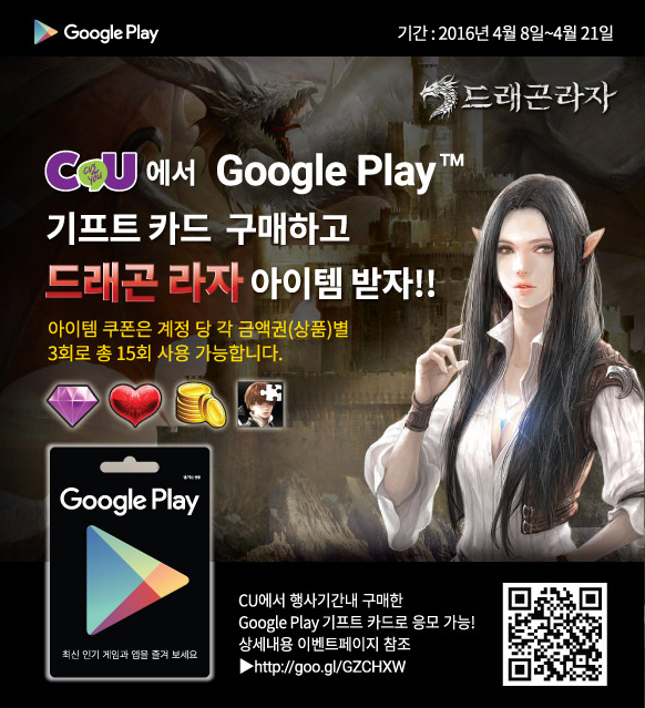 (서울=포커스뉴스) 로코조이 인터내셔널(대표 싱샨후)은 씨유(CU) 편의점에서 구글 플레이 기프트 카드를 구매하면 모바일게임 '드래곤라자'(개발사 비전브로스)의 게임 아이템을 제공한다고 8일 밝혔다.