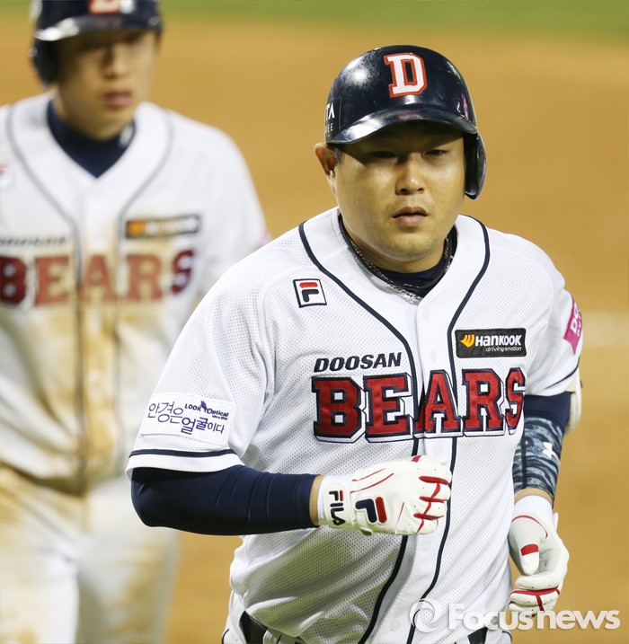 (서울=포커스뉴스) 8일 서울 잠실구장에서 열린 2016 프로야구 넥센-두산 경기 3회말 2사 2,3루에서 두산 양의지가 좌월 3점 홈런을 치고 홈인하고 있다.