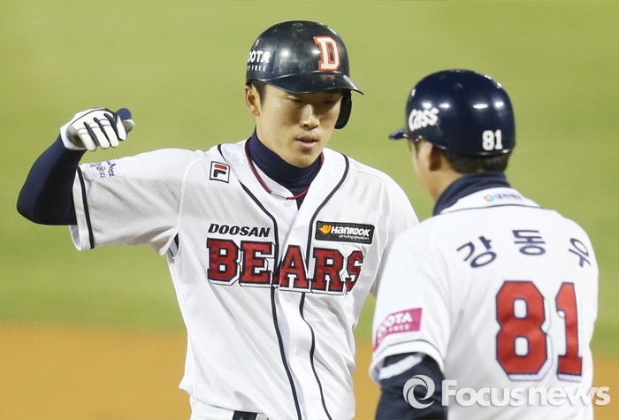 (서울=포커스뉴스) 8일 서울 잠실구장에서 열린 2016 프로야구 넥센-두산 경기 8회말 2사 1,3루에서 두산 허경민이 1타점 중ㄱ경수 앞 안타를 치고 1룽[서 강동우 코치와 손을 마주치고 있다.