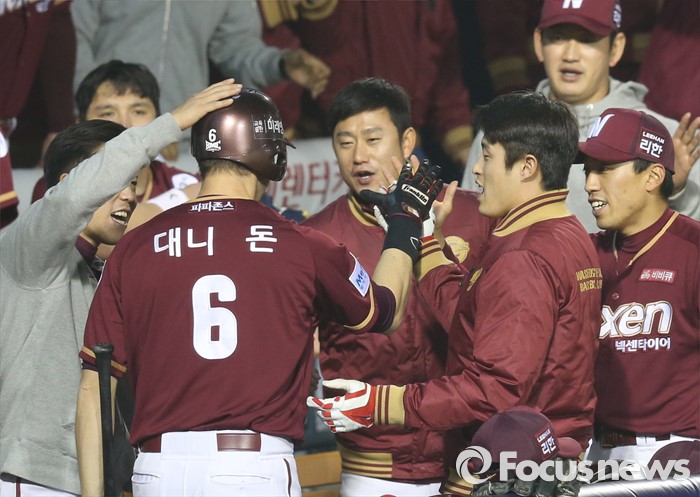 (서울=포커스뉴스) 8일 서울 잠실구장에서 열린 2016 프로야구 넥센-두산 경기 7회초 넥센 선두타자 대니 돈이 우월 1점 홈런을 치고 덕아웃에서 동료들의 축하를 받고 있다.