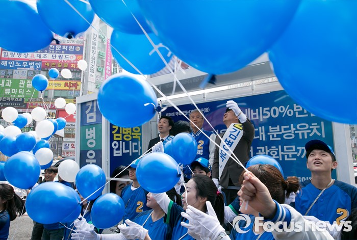 (성남=포커스뉴스) 10일 오후 경기도 성남 미금역 앞에서 열린 더불어민주당 분당 합동유세에 참석한 김종인 비대위 대표 겸 선대위원장과 후보들이 풍선을 날리는 퍼포먼스를 하고 있다. 왼쪽부터 김병관 분당갑 후보, 김 대표, 김병욱 분당을 후보.