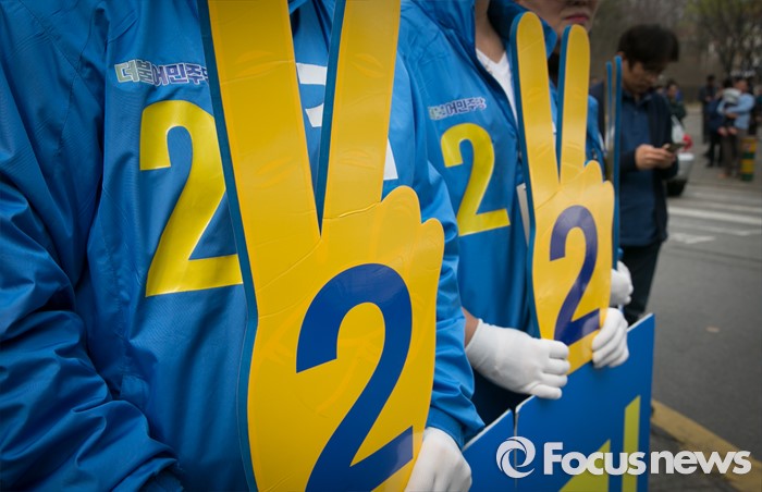 (용인=포커스뉴스) 10일 오후 경기도 기흥구청 인근 거리에서 김민기 더불어민주당 용인을 후보의 선거운동원들이 지지를 호소하고 있다.