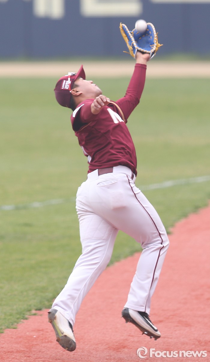 (서울=포커스뉴스) 10일 서울 잠실구장에서 열린 2016 프로야구 넥센-두산 경기4회말 2사 1,2루에서 넥센 1루수 홍성갑이 두산 에반스의 파울플라이를 잡고 있다.