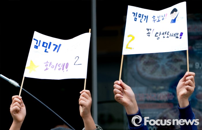 (용인=포커스뉴스) 10일 오후 경기도 기흥구청 인근 거리에서 어린이들이 김민기 더불어민주당 용인을 후보의 지지를 호소하고 있다.