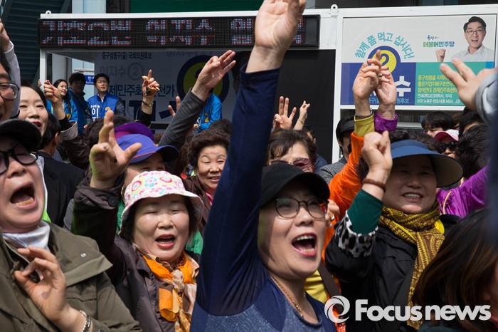 (서울=포커스뉴스) 20대 총선을 3일 앞둔 10일 오후 서울 성동구 옥수역 인근에서 유권자들이 정호준 국민의당 중구성동을 후보측에게 지지를 표하고 있다.