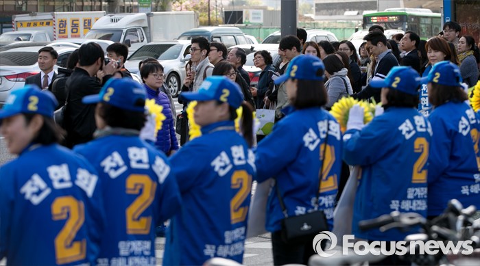 (서울=포커스뉴스) 20대 총선을 이틀 앞둔 11일 오전 서울 지하철 수서역 인근 거리에서 전현희 더불어민주당 강남을 후보의 선거운동원들이 지지를 호소하고 있다.