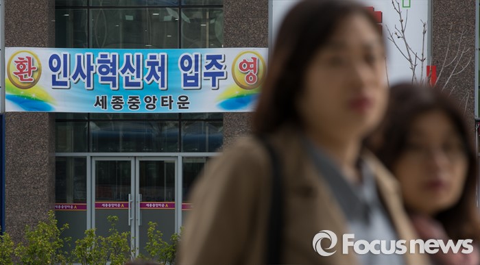 (세종=포커스뉴스) 세종시로 이전한 인사혁신처 직원들이 첫 출근한 11일 오전 인사혁신처 인근 상가건물에 입주환영 현수막이 붙어 있다.