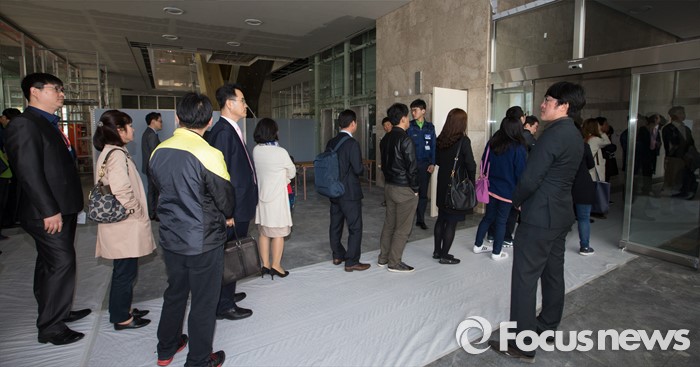 (세종=포커스뉴스) 세종시로 이전한 인사혁신처 직원들이 첫 출근한 11일 오전 세종시 절재로 인사혁신처에서 직원들이 신분확인을 받고 있다.