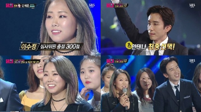 이수정은 JYP엔터테인먼트와 YG엔터테인먼트, 안테나 소속사 중에서 유희열 심사위원이 속한 안테나를 선택했다. SBS는 "이수정의 선택 당시 순간 시청률은 22.19%(닐슨코리아)를 기록했다"고 덧붙였다.10일 방송된 'K팝스타5' 마지막 회가 평균 시청률 14.4%(닐슨코리아)를 기록하며 동시간대 1위를 차지했다. 사진은 예능 장면 모음. <사진출처=SBS 'K팝스타5' 방송 캡처>