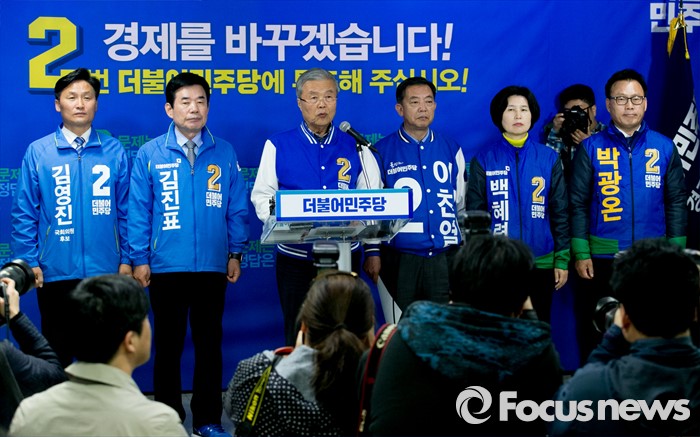 (수원=포커스뉴스) 20대 총선을 이틀 앞둔 11일 오전 수원 장안구 더불어민주당 경기도당 회의실에서 김종인 비대위 대표 겸 선대위원장이 수원 후보들과 대국민 성명 발표를 하고 있다. 왼쪽부터 김영진 수원병, 김진표 수원무 후보, 김 대표, 이찬열 수원갑, 백혜련 수원을, 박광온 수원정 후보.