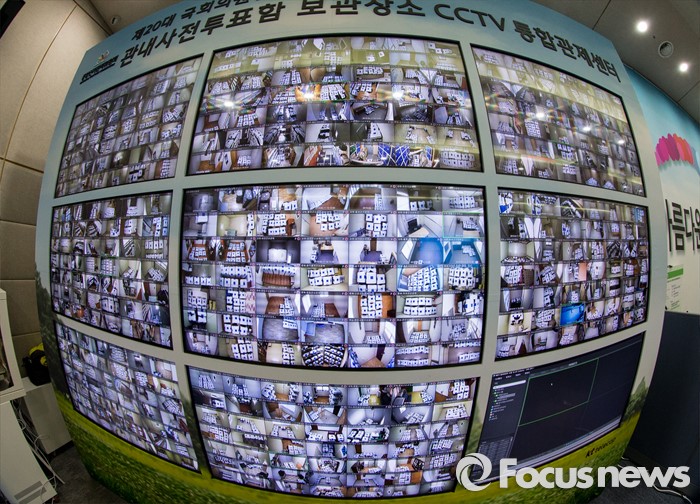 (과천=포커스뉴스) 4.13 총선을 이틀 앞둔 11일 오전 경기 과천 중앙선거관리위원회 내 관내사전투표함 보관장소 CCTV통합관제센터에서 선관위 관계자들이 실시간으로 투표함을 감시하고 있다.